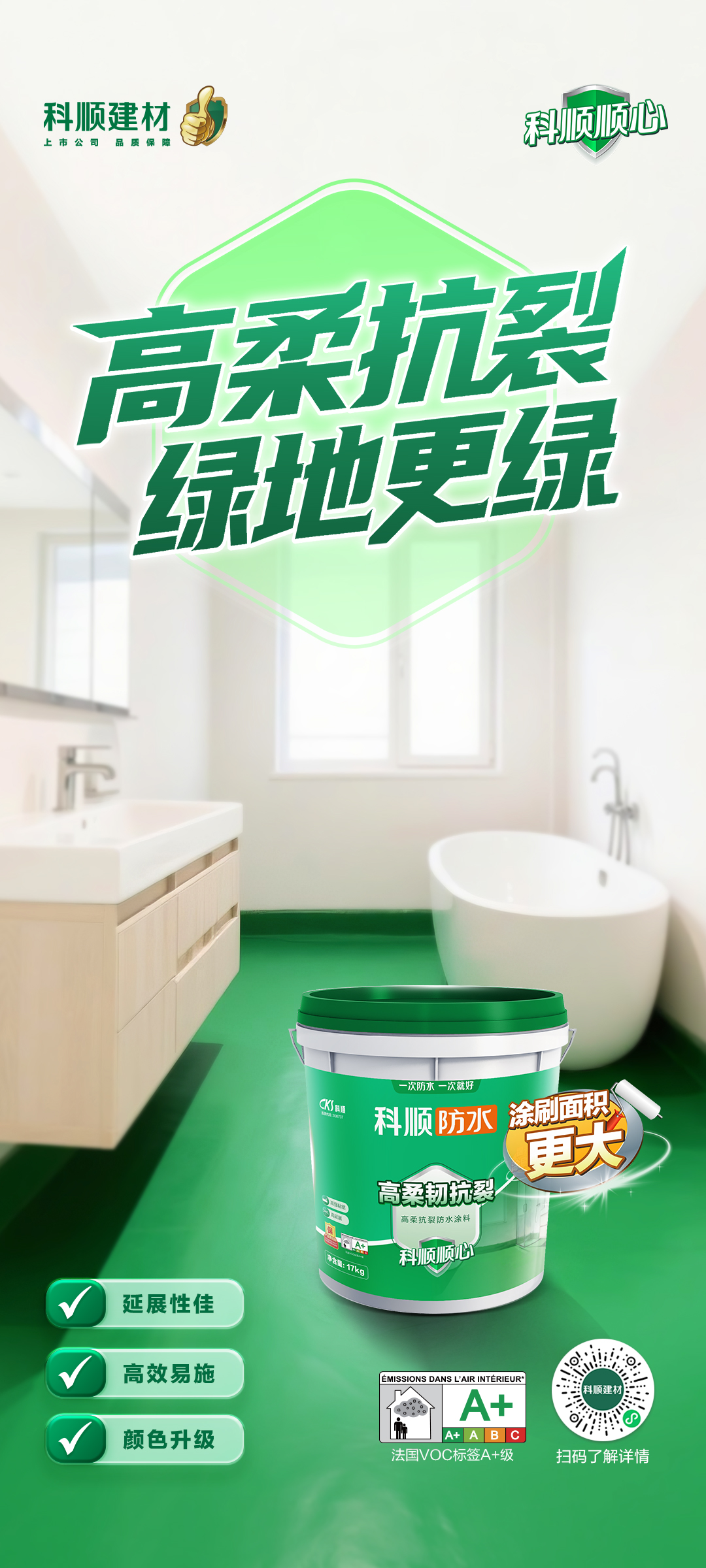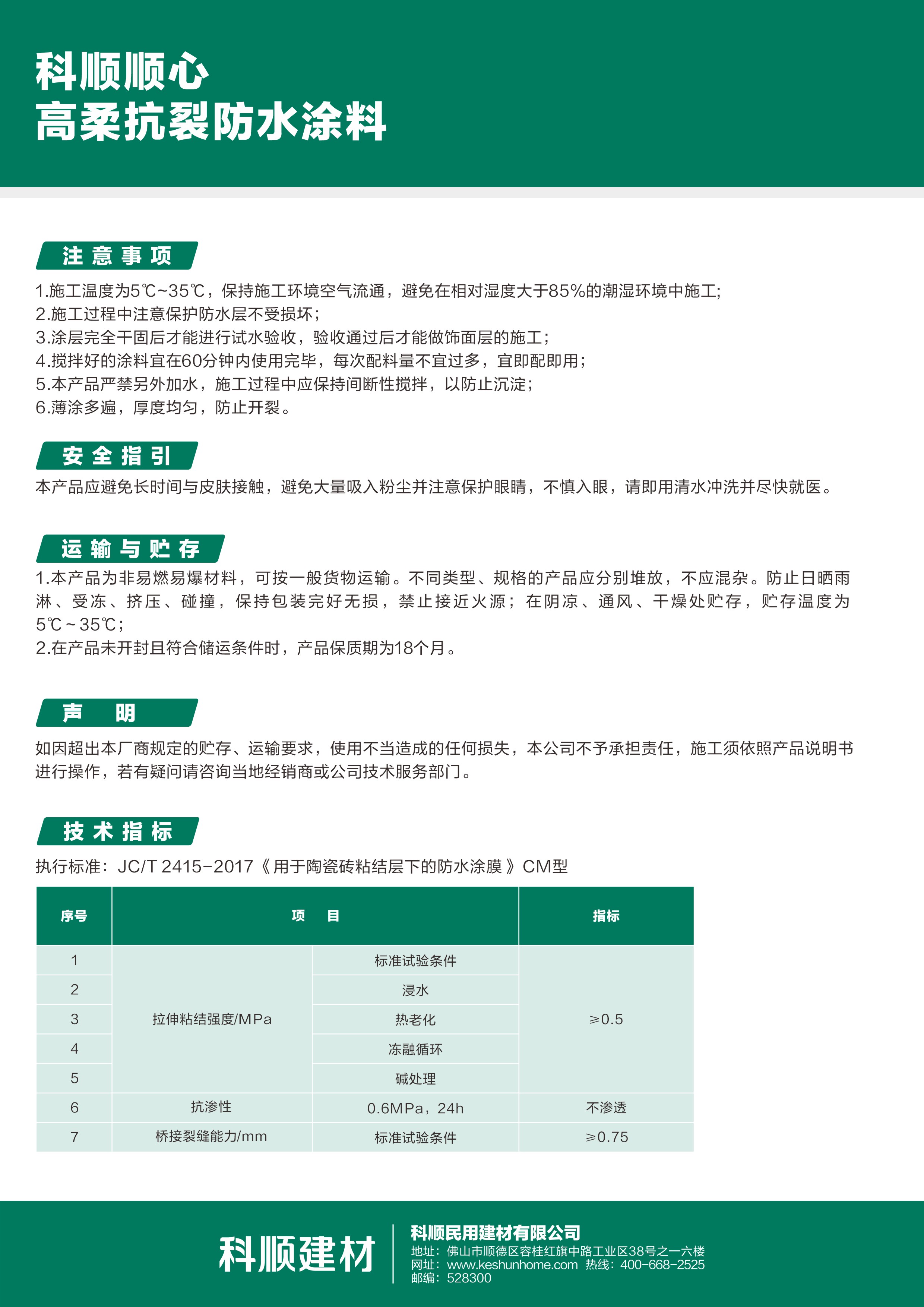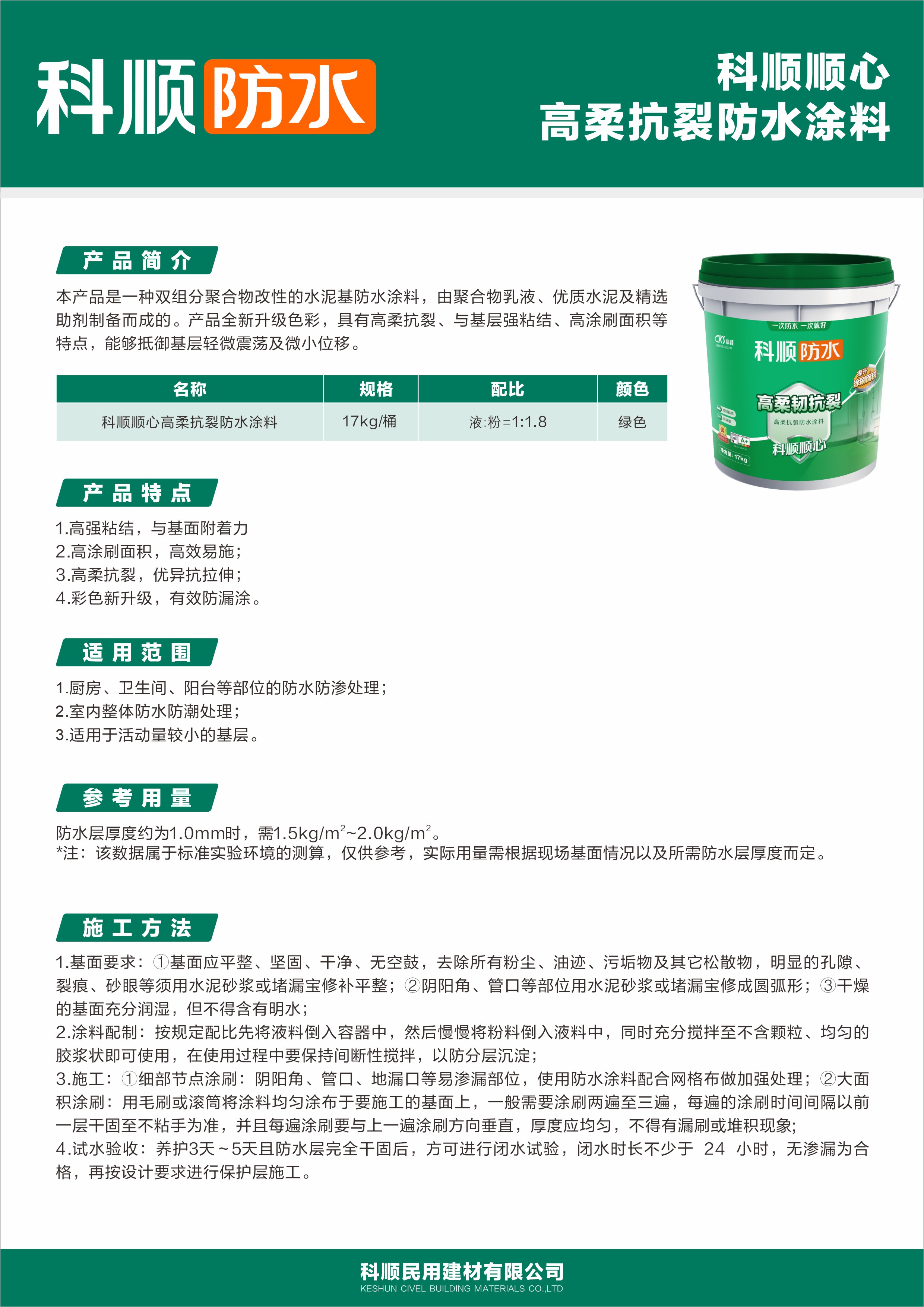 本產品是一種雙組分聚合物改性的水泥基防水涂料,由聚合物乳液、優質水泥及精選助劑制備而成的。產品全新升級色彩,具有高柔抗裂、與基層強粘結、高涂刷面積等特點,能夠抵御基層輕微震蕩及微小位移。